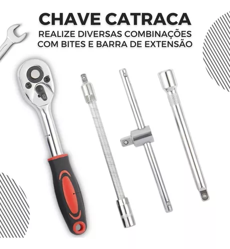 Acompanha catraca de engate rápido, soquetes de vários tamanhos, extensões flexíveis, chaves Allen e muito mais — tudo organizado em um estojo resistente e portátil.