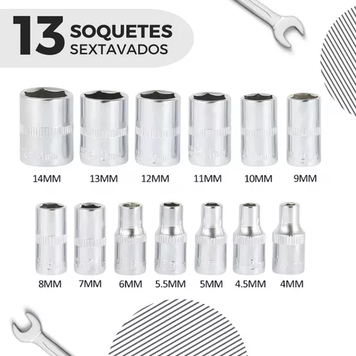 13x Soquetes DR 1/4″: 4, 4.5, 5, 6, 7, 8, 9, 10, 11, 12, 13, 14 mm